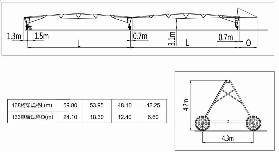 適用于長條形的大面積的農(nóng)業(yè)灌溉,具有經(jīng)濟、高效、堅固耐用和操作簡便的特點。以耕地寬度為設備的設計長度,設備沿耕地長度方向可往復行走,與圓形噴灌機相比,無明顯的噴灌死角,幾乎百分百覆蓋。根據(jù)設備桁架的數(shù)量和型號,灌溉寬度可達384m。