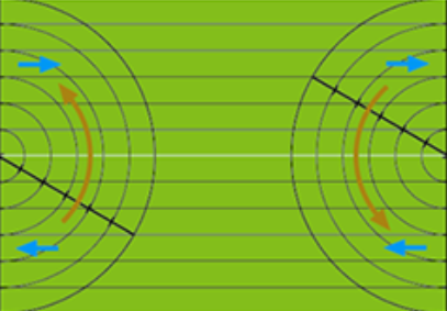 可旋轉平移式噴灌機,除了具有常規(guī)的平移噴灌功能外,還可以在耕地兩端進行無水旋轉,使設備的覆蓋面積增加一倍,有效降低設備的投資成本。其工作原理示意如下: