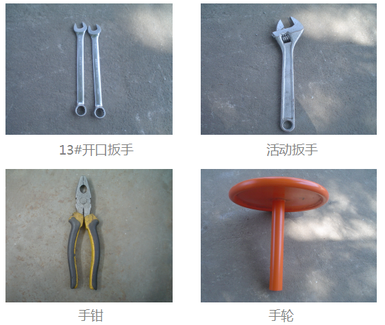 所需工具:13#開口扳手2把、活動扳手、手鉗、手輪 |