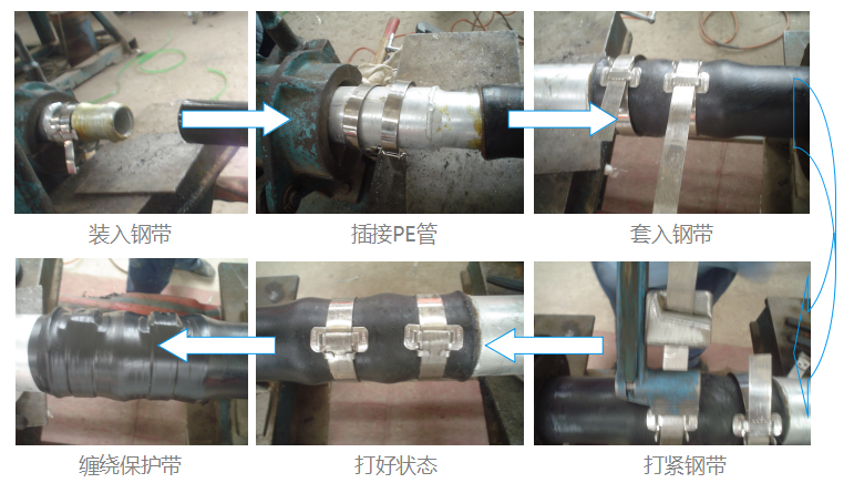 裝上鋼帶、插接PE管、打緊鋼帶(打鋼帶時(shí)必須注意掌握鋼帶的打緊力度)。