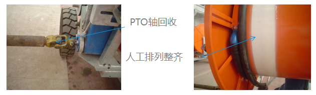 通水或使用PTO軸收回PE管(回收時(shí)卷盤上的頭幾圈的PE管必須人工排整齊)。