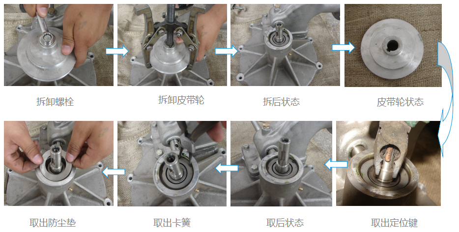 拆下水渦輪皮帶輪及主軸處彈性擋圈,在主軸葉輪側(cè)上一M10螺栓,用手錘敲打螺栓擊出主軸。取出機(jī)械密封的靜環(huán)。