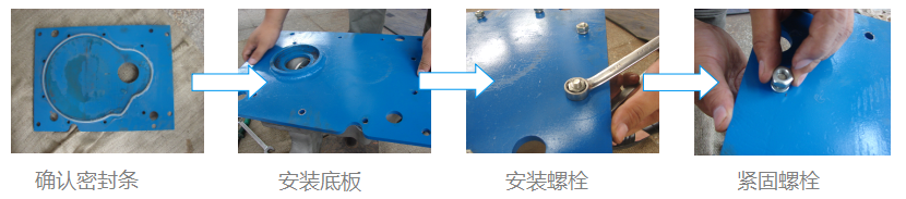 安裝水渦輪座板,緊固螺栓(如殼體上密封條損壞需更換后涂密封膠安裝) |